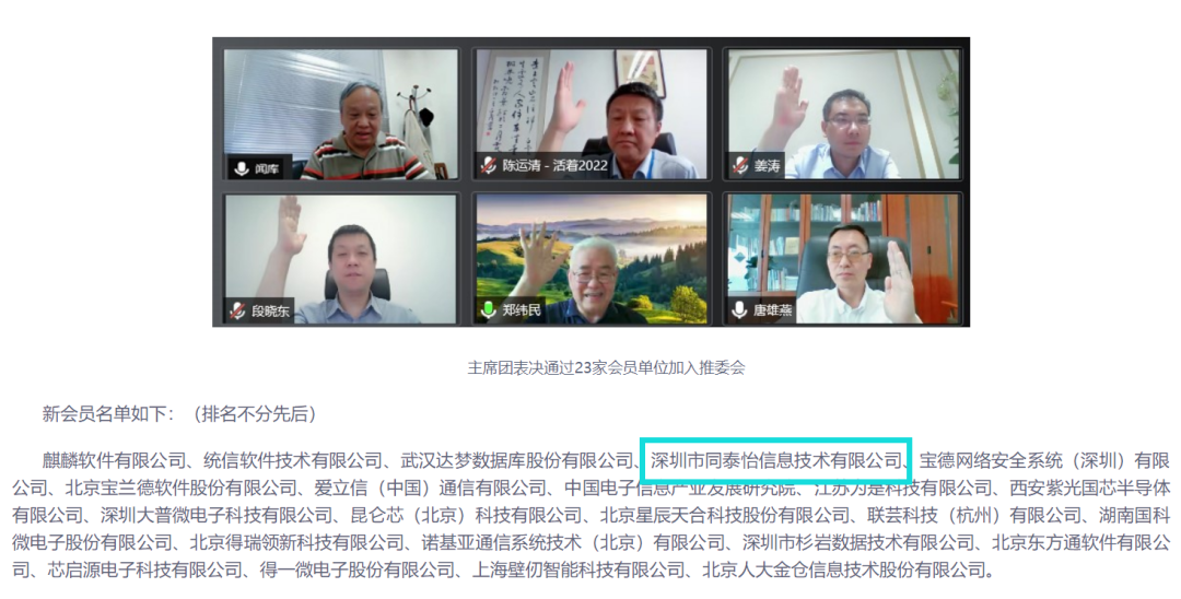 近日,中国通信标准化协会 多样性算力产业及标准推进委员会(CCSA TC622,以下简称“推委会”)在北京举行第一届主席团第一次会议。中国通信标准化协会副理事长兼秘书长闻库、推委会主席郑纬民院士、副主席中国移动研究院段晓东副院长、中国电信研究院陈运清副院长、中国联通研究院唐雄燕副院长、华为计算产品线副总裁姜涛以及推委会成员单位代表出席会议。按照新冠疫情防控要求,大会采用线上会议的方式。深圳市同泰怡信息技术有限公司(以下简称“同泰怡”)凭借深厚的技术底蕴,经主席团审议通过,成功加入推委会并成为会员单位。