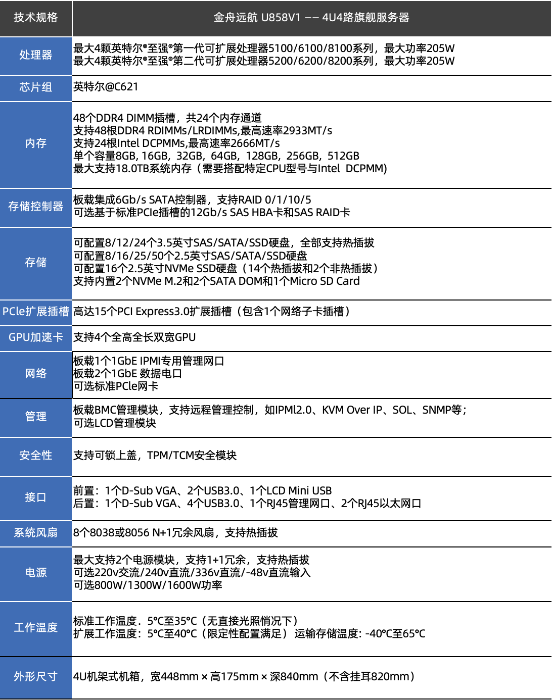 远航U858V1是一款自主研发的4U四路机架式服务器,基于易用的设计理念,提供灵活的配置和强大的扩展能力,可广泛适用于企业关键应用,如:数据库、ERP、高性能计算、虚拟化等应用场景。