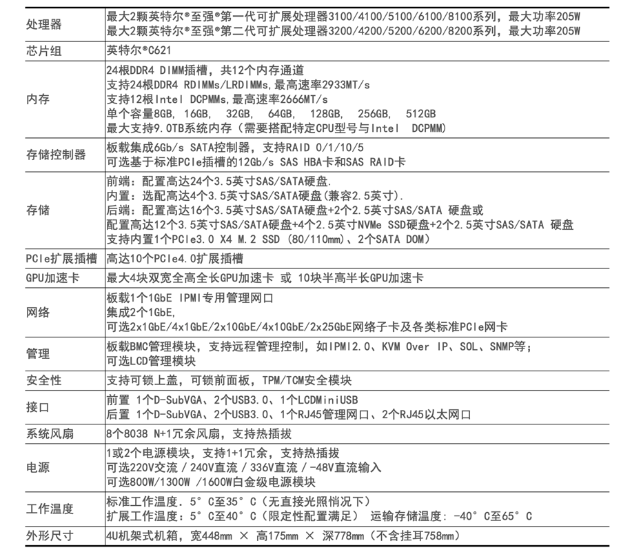支持2颗英特尔®至强®可扩展处理器(Sky Lake & Cascade Lake),支持最高2UPI总线,最高速率能到10.4GT/s,支持最多24根DDR4内存,可实现最高9.0TB的内存容量,能轻松处理复杂的工作负载,适合冷热数据存储、视频监控、云存储、备份等应用场景。